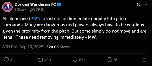 “All clubs require the FA to launch an immediate investigation into pitch surroundings. Many are dangerous, and players must constantly exercise caution given their proximity to the pitch,” he added.