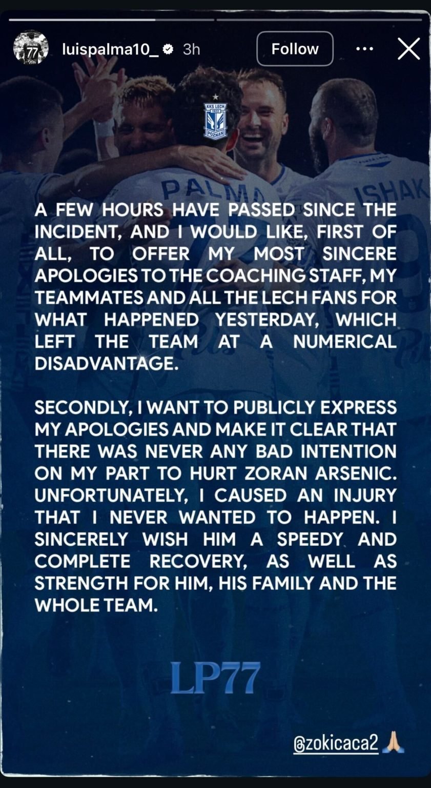 Palma has now officially apologised for his violent tackle on Rakow skipper Zoran Aresnic via an Instagram story post.