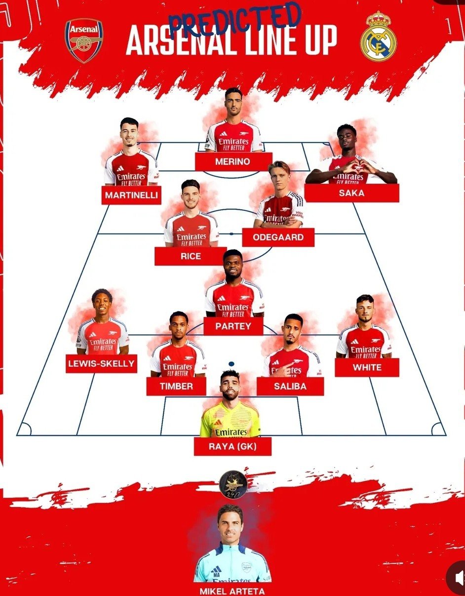 Raya, Timber, Saliba, Kiwior, Lewis-Skelly; Odegaard, Partey, Rice; Saka, Merino, Martinelli are all potential starters for Arsenal.